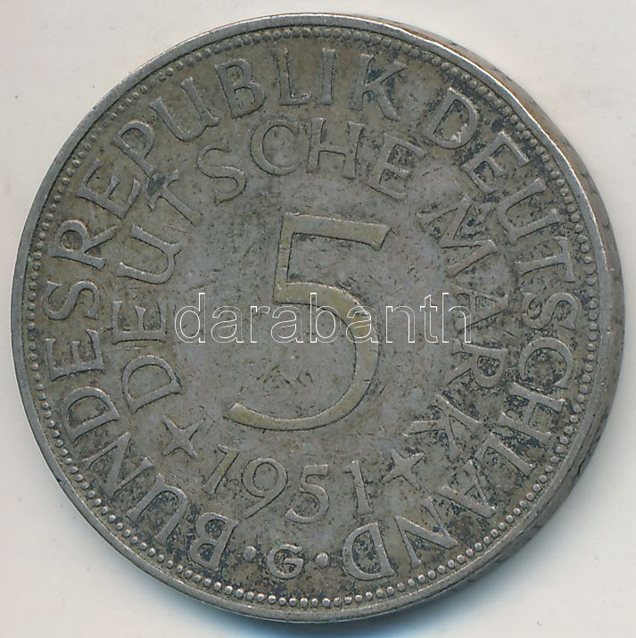 FRG 1951G 5 Mark Ag C:VF https://www.darabanth.com/hu/265-Gyorsarveres/265.0/Numizmatika/Kulfoldi-fem-es-ezustpenzek~400013/NSZK-1951G-5M-Ag-T2---FRG-1951G-5-Mark-Ag-CVF~II1326398