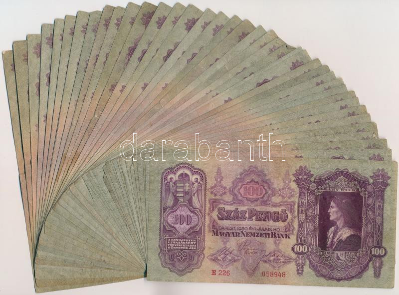 1930. 100P (50x) T:III,III- https://www.darabanth.com/hu/265-Gyorsarveres/265.0/Numizmatika/Magyar-bankjegyek~400007/1930-100P-50x-TIII-III-~II1327179