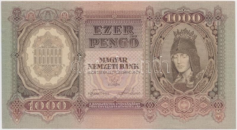 1943. 1000P T:III szép papír https://www.darabanth.com/hu/265-Gyorsarveres/265.0/Numizmatika/Magyar-bankjegyek~400007/1943-1000P-TIII-szep-papir~II1327481