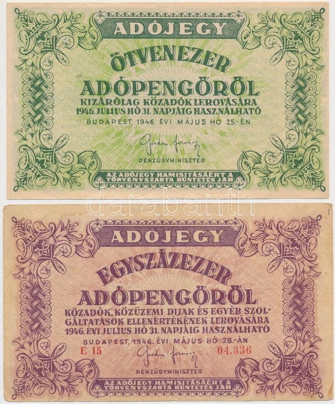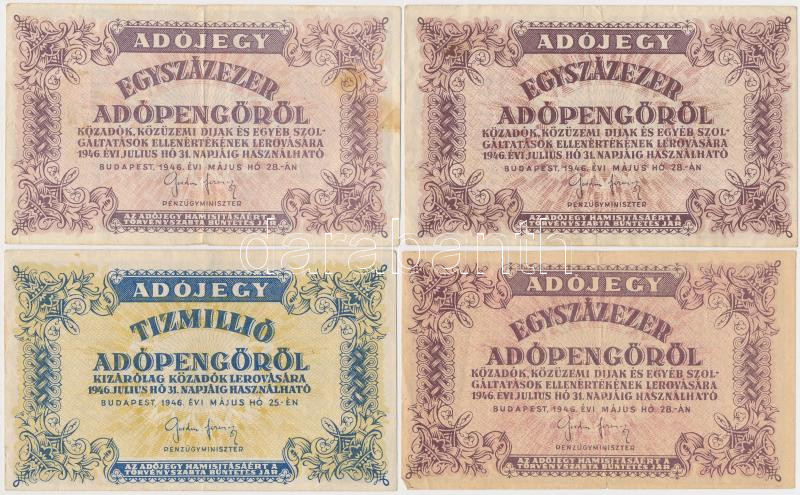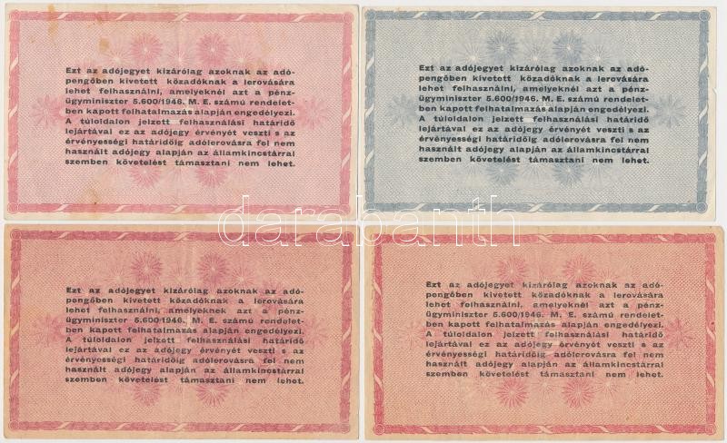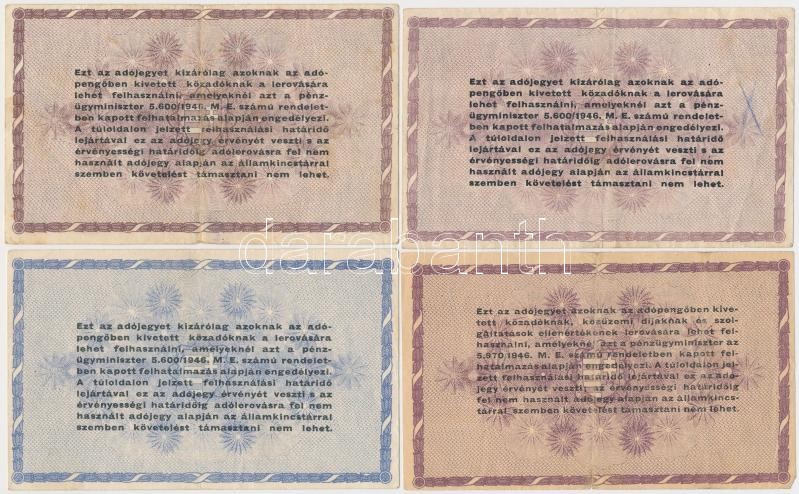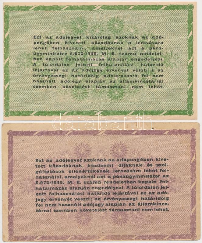 Leírás: 1946. 10db-os vegyes magyar adópengő bankjegy tétel, közte fordított címeres, sorozat- és sorszám nélküli is T:II,III