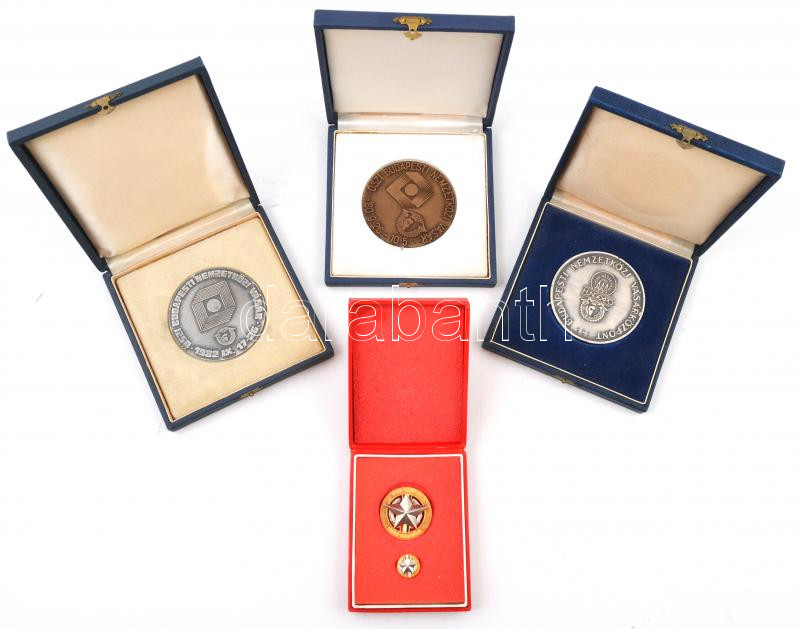 1975,1980,1982. "HUNGEXPO / Őszi Budapesti Nemzetközi Vásár" fém és Br részvételi emlékérem eredeti tokban (3xklf) (70mm) + ~1970-1980. "Az Ipari Szövetkezet Kiváló Dolgozója" fém jelvény tokban miniatűrrel T:2