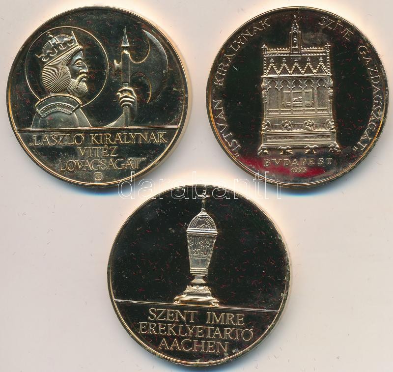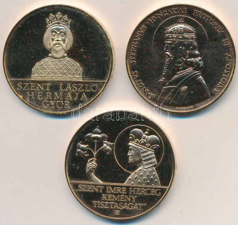 Fülöp Zoltán (1951-) / Madarassy Walter (1909-1994) DN "Magyar Szentek I. - Szent István, Szent László, Szent Imre" 3xklf db-ból álló aranyozott tombak emlékérem szett eredeti dísztokban tanúsítvánnyal (40mm) T:PP felületi karc, peremen lepattanások, zöldes patina