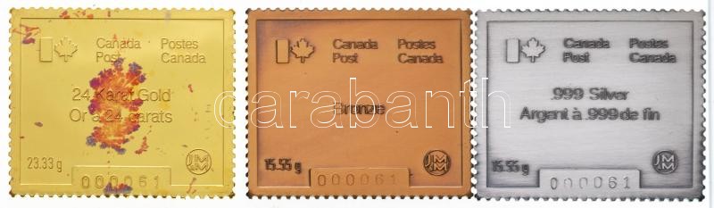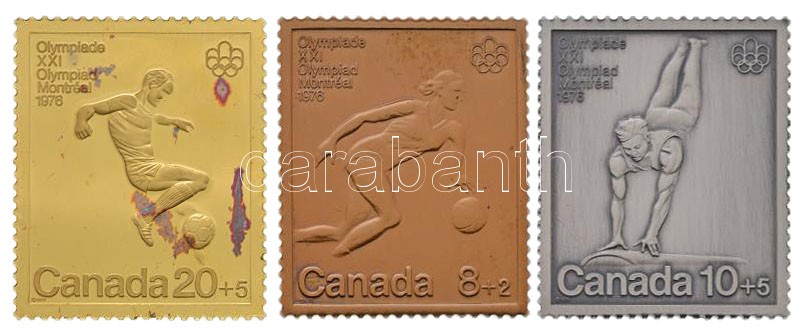 Kanada 1975. "XXI. nyári olimpiai játékok, Montreal 1976" 3db bélyegérem: "Futball" Au (23,63g/0.999/36,5x30mm), "Torna" Ag (15,65g/0.999/36,5x30mm) és "Kézilabda" Br (15,89g/36,5x30mm) mindhárom "61" sorszámmal, eredeti bársonnyal bélelt fa dísztokban, valamint 3db bélyeggel T:PP folt és felületi karc,1- Canada 1975. "Games of the XXI Olympiad, Montreal 1976" 3pcs of stamp coins: "Football" Au (23,63g/0.999/36,5x30mm), "Gymnastics" Ag (15,65g/0.999/36,5x30mm) and "Handball" Br (15,89g/36,5x30mm) all with "61" serial number, in original case, and with 3 stamps C:PP spotted, slightly scratched,AU