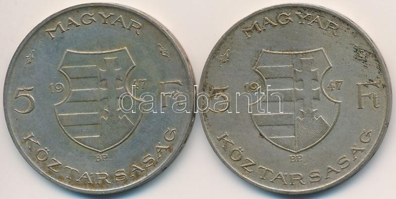 1947. 5Ft Ag "Kossuth" (2x) T:2- https://www.darabanth.com/hu/265-Gyorsarveres/265.0/Numizmatika/Magyar-es-magyar-verdejelu-fem-es-ezustpenzek~400008/1947-5Ft-Ag-Kossuth-2x-T2-~II1323600