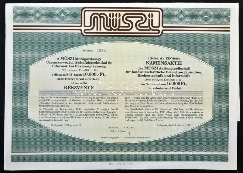 Leírás: 1991. "MÜSZI Mezőgazdasági Üzemszervezési, Számítástechnikai és Informatikai Rt." részvénye 10.000Ft-ról szelvényekkel T:I-