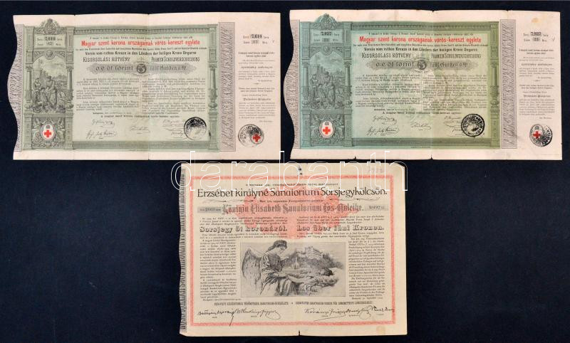 Budapest 1882. "Magyar szent korona országainak vörös-kereszt egylete" kisorsolási kötvény 5Ft-ról bélyegzésekkel (2x) + 1904. "Erzsébet királyné Sanatorium Sorsjegykölcsön" sorsjegye 5K-ról, szárazpecséttel T:III kis szakadások