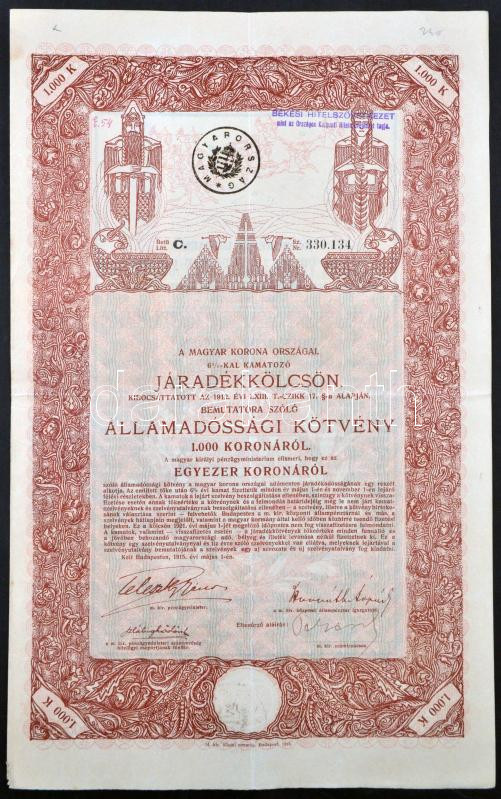 Budapest 1916. "A Magyar Korona Országai 6%-kal kamatozó járadékkölcsön" államadóssági kötvény 1000K-ról, szelvényekkel, szárazpecséttel és bélyegzéssel T:III