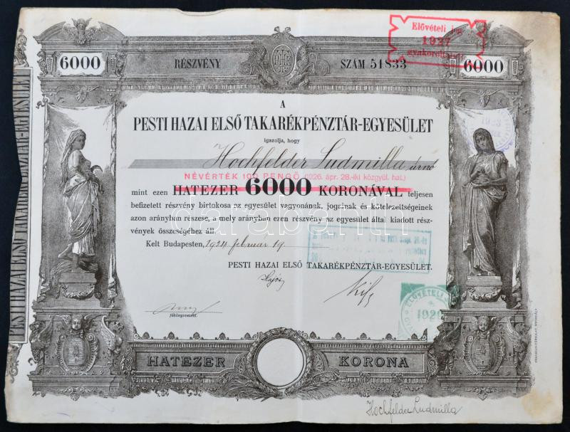 Budapest 1924. "Pesti Hazai Első Takarékpénztár-Egyesület" r... https://www.darabanth.com/hu/265-Gyorsarveres/265.0/Numizmatika/Reszvenyek-es-sorsjegyek~400005/Budapest-1924-Pesti-Hazai-Elso-Takarekpenztar-Egyesulet-reszvenye-6000K-rol-felulbelye~II1326144