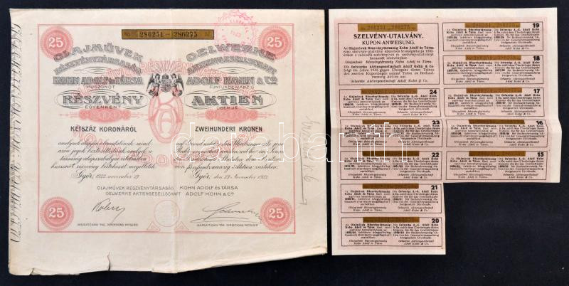 Leírás: Győr 1922. "Olajművek Részvénytársaság Kohn Adolf és Társa" részvény 200K-ról szelvényekkel, bélyegzésekkel T:III kis szakadások