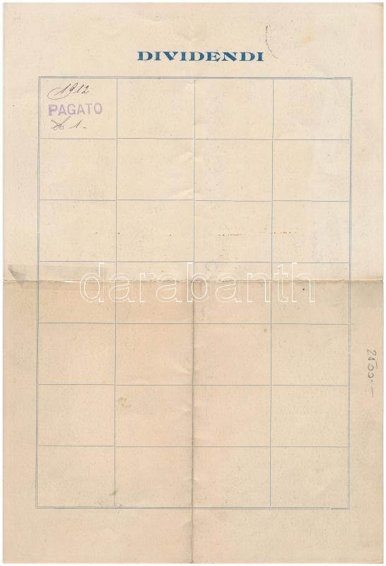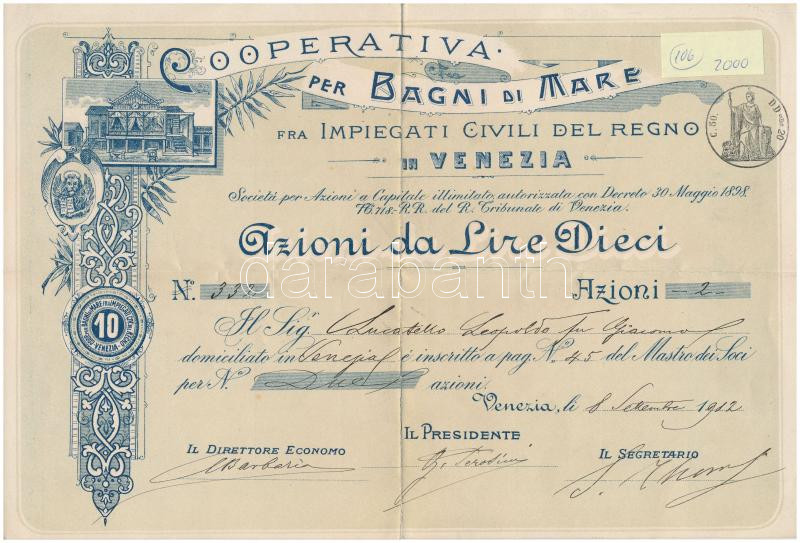 Italy / Venice 1912. "Cooperativa per Bagni di Mare" share about 10 Lire C:VG taped