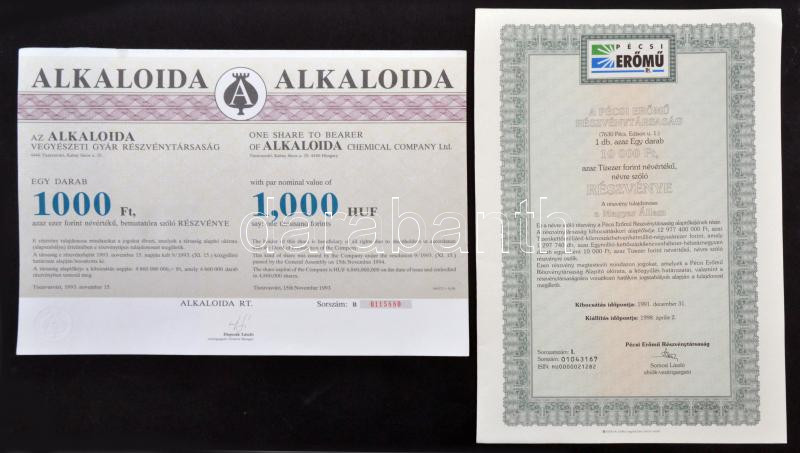 Leírás: Tiszavasvári 1993. "Alkaloida Vegyészeti Gyár Részvénytársaság" részvénye 1000Ft-ról szelvényekkel, 1998. "Pécsi Erőmű Részvénytársaság" részvénye 10.000Ft-ról szelvényekkel T:I,I-