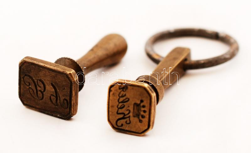Leírás: 2 db régi réz monogramos pecsétnyomó, h: 4 és 4,5 cm
