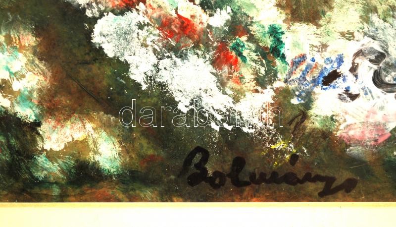 Leírás: Bolmányi jelzéssel: Tavaszi virágzás. Tempera, papír, üvegezett keretben, paszpartuval 21x31 cm.