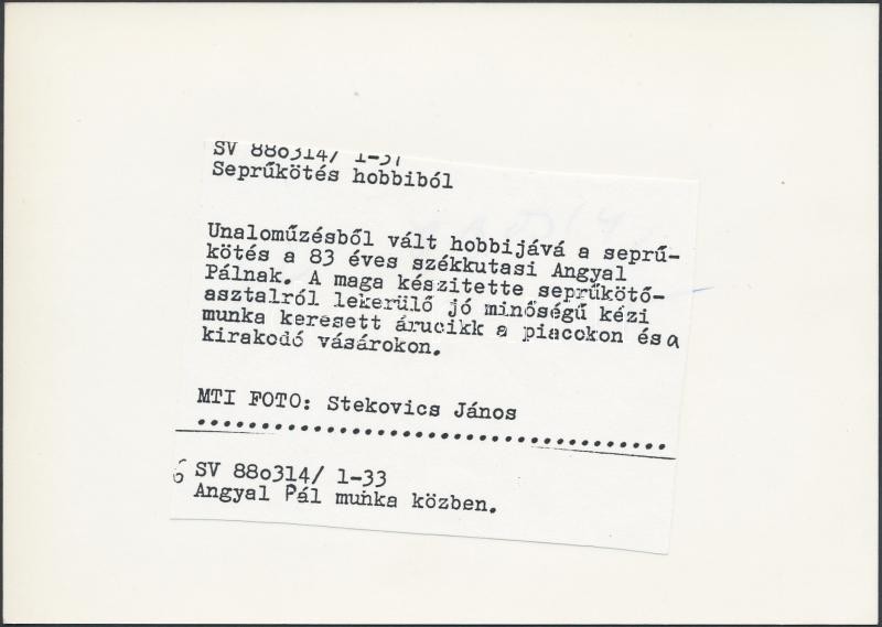 1988 Seprűkötés hobbiból, Stekovics János, MTI fotó verzón feliratozva... https://www.darabanth.com/hu/266-Gyorsarveres/266.0/Festmeny-mutargy-papirregiseg-egyeb/Foto~18/1988-Seprukotes-hobbibol-Stekovics-Janos-MTI-foto-verzon-feliratozva-13x18cm~II1333065