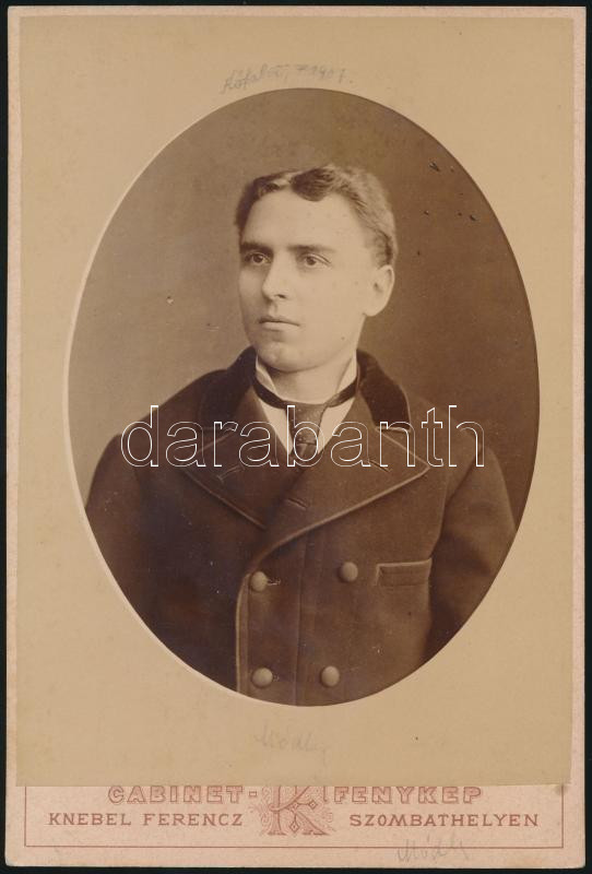 Leírás: cca 1890 Módly Krizsó tanár portréja Knébel Ferenc szombathelyi műterméből, feliratozva, kabinetfotó méretben, 16,5x11 cm