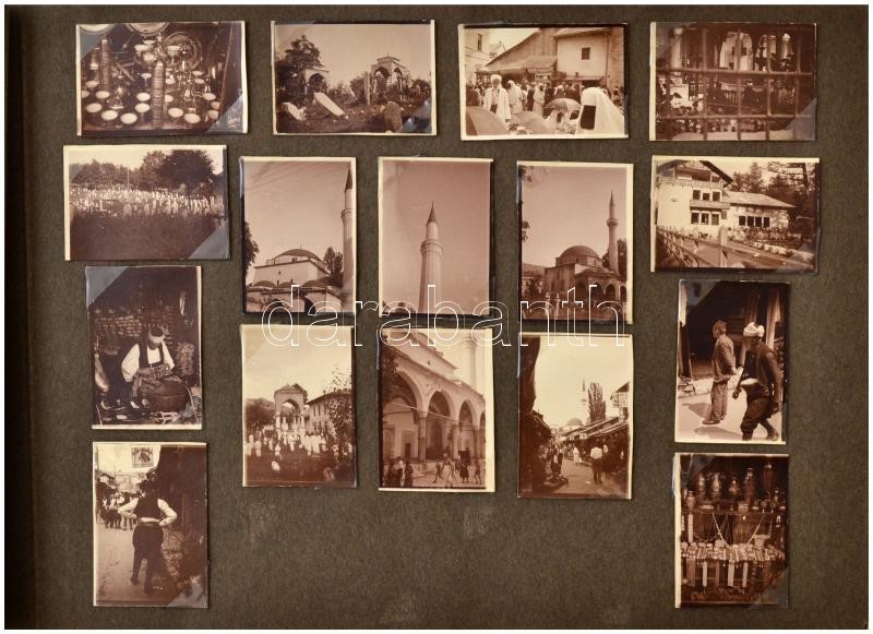 cca 1920 Boszniai utazás életképei. Kis házi készítésű album, benne mozgalmas helyi fotókkal 45 fotó és fotólap /