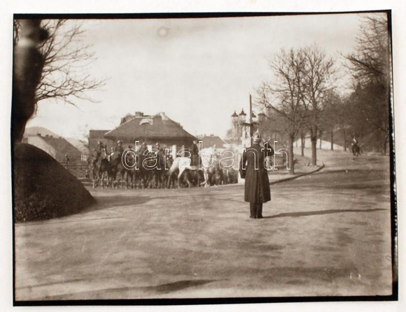 Leírás: cca 1940 Horthy Miklós fehér lovon, egy katonai alakulat élén, útban a budavári palotába, korabeli negatívról későbbi fotó, 8,5x11 cm