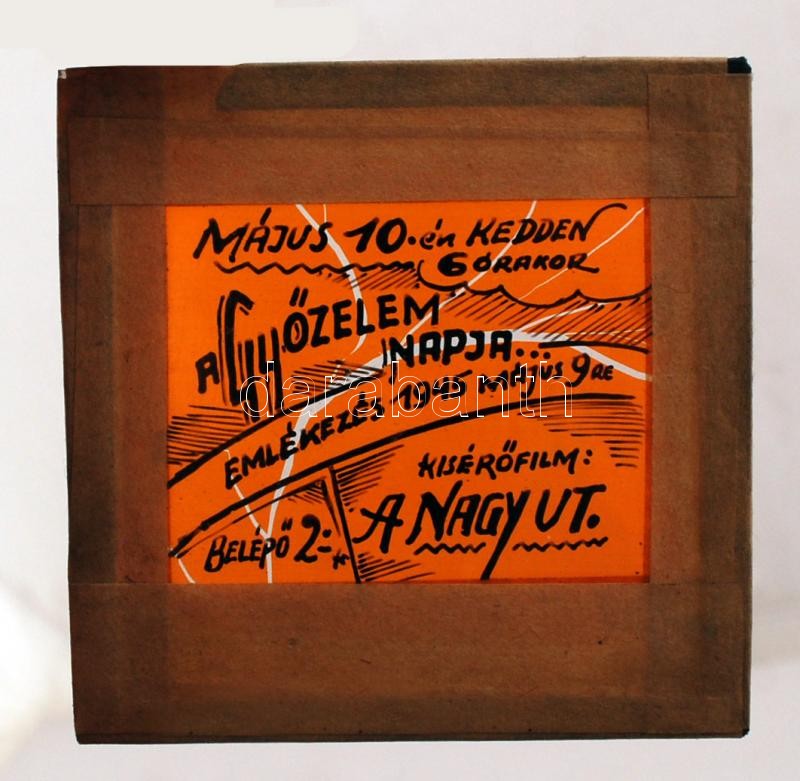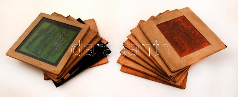 cca 1948 Fekete György (1904-1990) budapesti fényképész specialitása a mozikban nagyfilmek előtt vetített álló diapozitív reklámképek voltak, ez az összeállítás társadalmi célú reklámokat, tájékoztatókat tartalmazza, 13 db diapozitív üveglemezen, színezett, 8x8 cm
