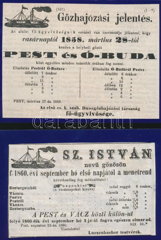 Leírás: 1858-1860 A Dunagőzhajózási Társaság két hajózással kapcsolatos hirdetménye kivágáson. / Announcements of the DDSG 13x10 cm
