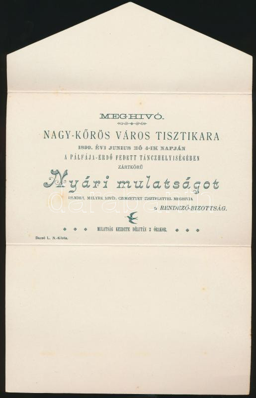 1899 Meghívó Nagykőrös város tisztikarának nyári mulatságára. Névre sz... https://www.darabanth.com/hu/266-Gyorsarveres/266.0/Festmeny-mutargy-papirregiseg-egyeb/Nyomtatvanyok~25/1899-Meghivo-Nagykoros-varos-tisztikaranak-nyari-mulatsagara-Nevre-szolo-~II1336072