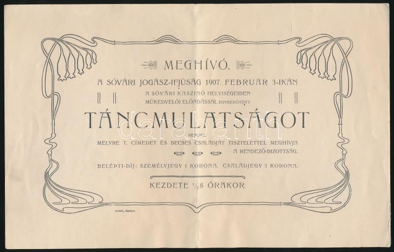 Leírás: 1907 Meghívó a Sóvári Jogász-Ifjúság februári táncmulatságára szecessziós díszítéssel
