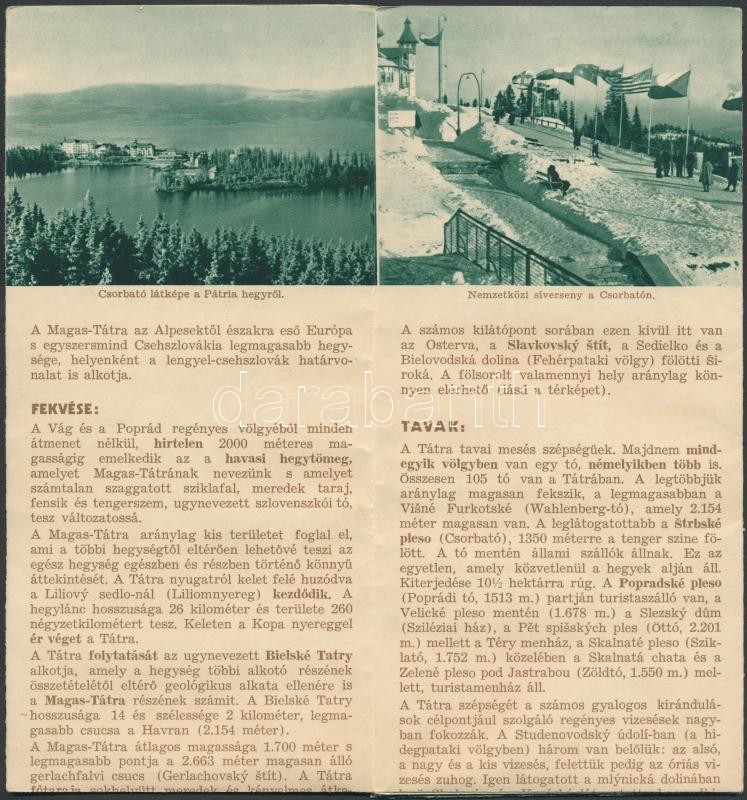 Leírás: 1935 Magas Tátra idegenforgalmi kiadvány magyar nyelven, fotókkal és térképpel illusztrált széthajthatós nyomtatvány, 42x60cm