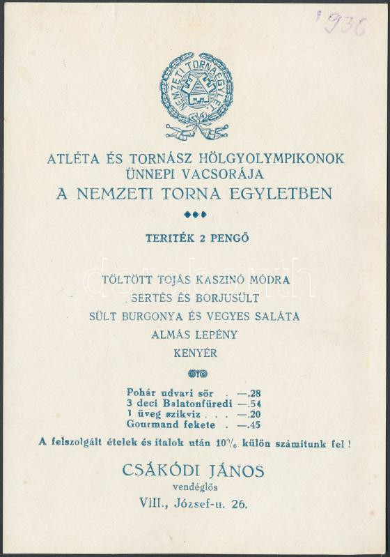 1936 Az atléta és tornász hölgyolimpikonoknak a Nemzeti Torna Egyletbe... https://www.darabanth.com/hu/266-Gyorsarveres/266.0/Festmeny-mutargy-papirregiseg-egyeb/Nyomtatvanyok~25/1936-Az-atleta-es-tornasz-holgyolimpikonoknak-a-Nemzeti-Torna-Egyletben-megrendezett-unnepi-vac~II1333422