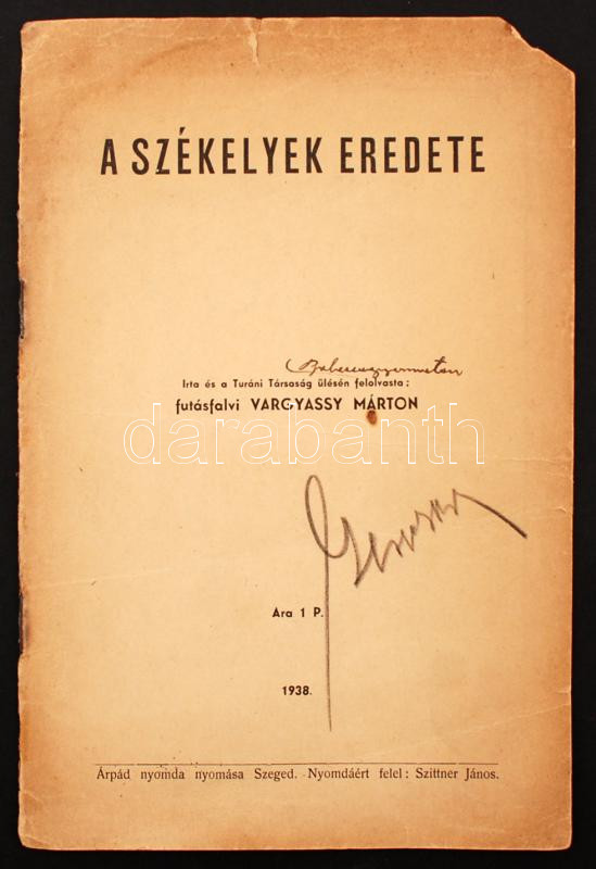 1938 futásfalvi Vargyassy Márton: A székelyek eredete. pp.:10, 23x15cm https://www.darabanth.com/hu/266-Gyorsarveres/266.0/Festmeny-mutargy-papirregiseg-egyeb/Nyomtatvanyok~25/1938-futasfalvi-Vargyassy-Marton-A-szekelyek-eredete-pp10-23x15cm~II1333567