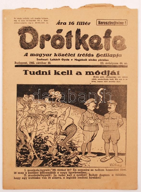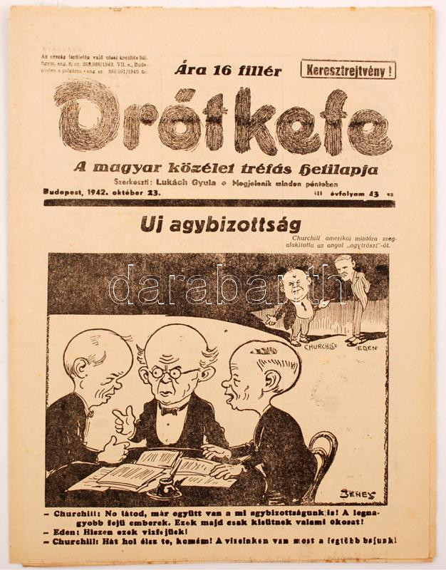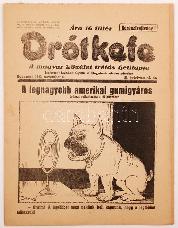 1942 Drótkfefe, A magyar közélet tréfás hetilapja, szerk.:Lukách Gyula... https://www.darabanth.com/hu/266-Gyorsarveres/266.0/Festmeny-mutargy-papirregiseg-egyeb/Nyomtatvanyok~25/1942-Drotkfefe-A-magyar-kozelet-trefas-hetilapja-szerkLukach-Gyula-3-szama-pp8-32x24~II1249581