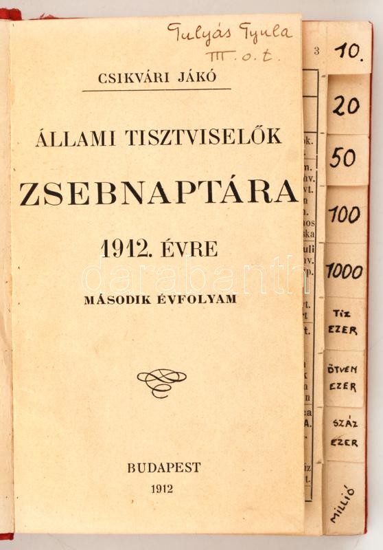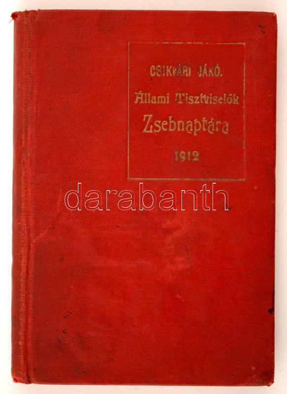 Csíkvári Jákó: Állami tisztviselők zsebnaptára. Bp., 1912. Kissé hullá... https://www.darabanth.com/hu/266-Gyorsarveres/266.0/Festmeny-mutargy-papirregiseg-egyeb/Nyomtatvanyok~25/Csikvari-Jako-Allami-tisztviselok-zsebnaptara-Bp-1912-Kisse-hullamos-egeszvaszon-ko~II1321327