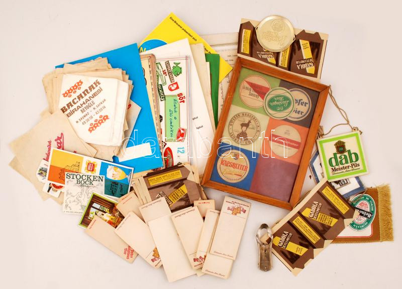 Leírás: Sörrel kapcsolatos reklámok gyűjteménye: számolócédulák, reklámnyomtatványok, söralátétek, kisebb tematikus sörcímke gyűjtemény, plakátok vegyesen / Collection of beer advertisings