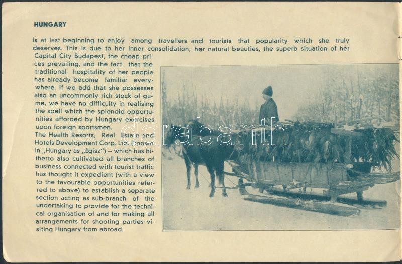 Leírás: cca 1930 Do Your Shooting in Hungary! Angol nyelvű reklám nyomtatvány hasznos információkkal magyarországi vadászatról, pp.:7, 15x23cm