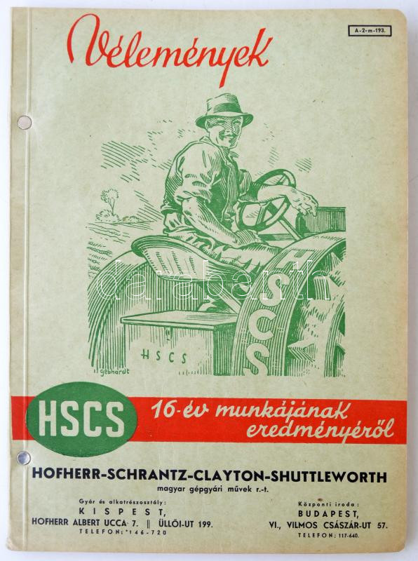 Leírás: cca 1930 HSCS vélemények 16 év munkájáról képes reklám kiadvány. Gebhardt grafikával 131p.