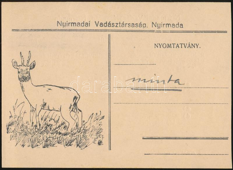 cca 1940 A Nyírmadai vadásztársaság grafikus levelezőlapja előrenyomot... https://www.darabanth.com/hu/266-Gyorsarveres/266.0/Festmeny-mutargy-papirregiseg-egyeb/Nyomtatvanyok~25/cca-1940-A-Nyirmadai-vadasztarsasag-grafikus-levelezolapja-elorenyomott-meghivoval~II1335981