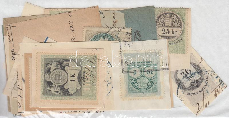 Leírás: 11 g okmánybélyeg az 1800-as évekből főleg kivágásokon tasakban ömlesztve