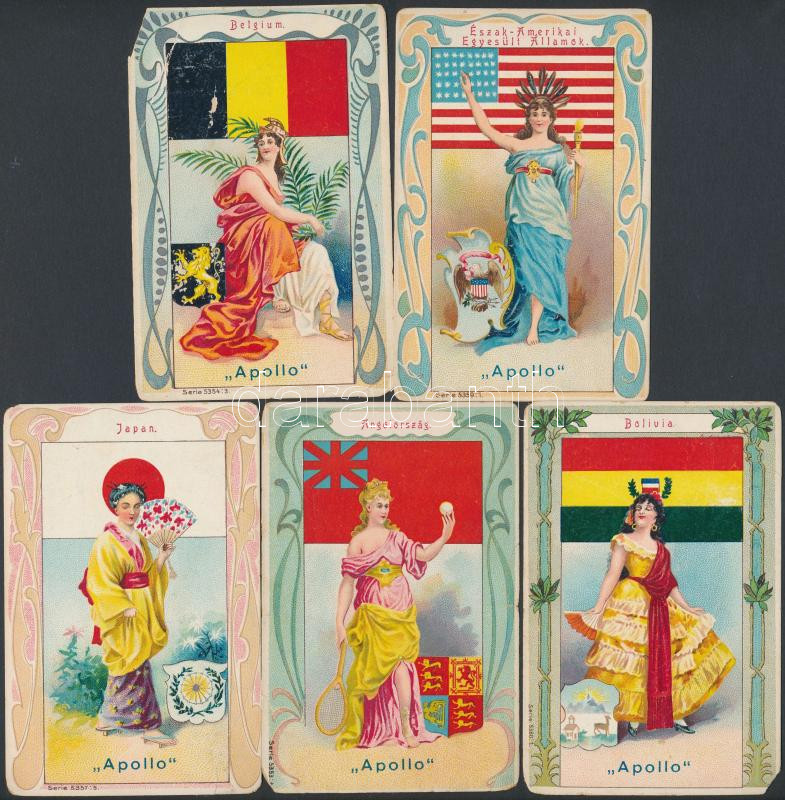 Leírás: 5 db szecessziós országmotívumos Apollo gyertya- és szappangyárak reklámkártya