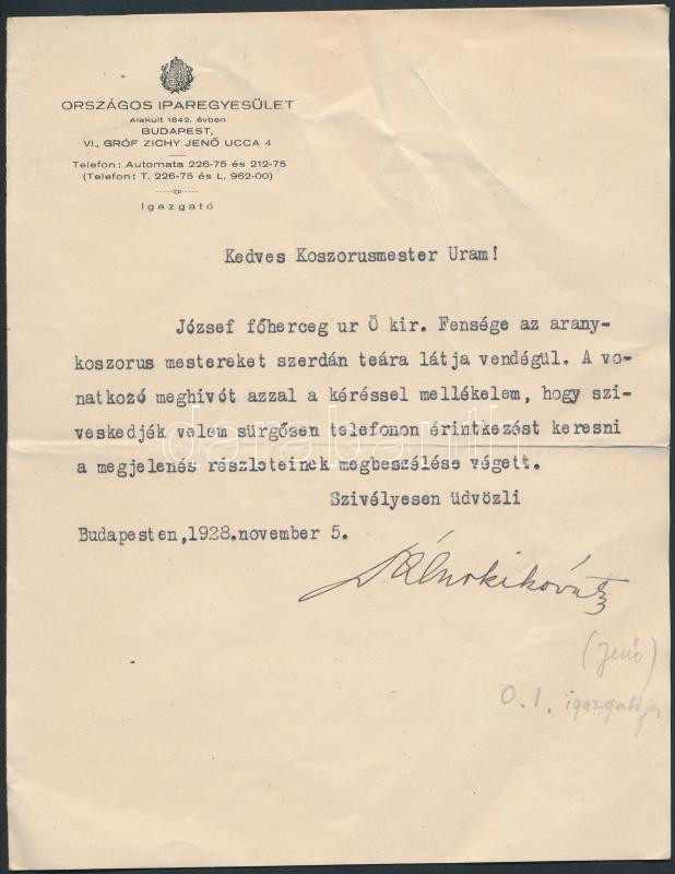 Leírás: 1928 Tea meghívó József főherceghez az Országos Iparegyesület fejléces levelén Dálnoki Kovács Jenő aláírásával, hajtás mentén kis szakadással, 21x17cm