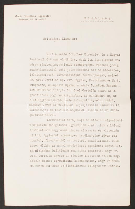 Leírás: 1939 Bp., Gróf Apponyi Albertné, a Mária Dorothea Egyesület elnökének levele Dr. Orel Coriolán ügyében, saját kezű aláírásával