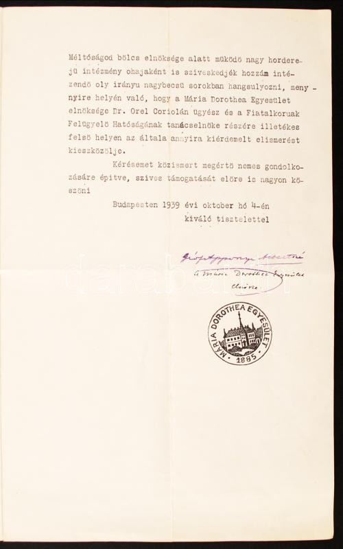 1939 Bp., Gróf Apponyi Albertné, a Mária Dorothea Egyesület elnökének ... https://www.darabanth.com/hu/266-Gyorsarveres/266.0/Festmeny-mutargy-papirregiseg-egyeb/Tortenelmi-dokumentumok-keziratok-erdekessegek~16/1939-Bp-Grof-Apponyi-Albertne-a-Maria-Dorothea-Egyesulet-elnokenek-levele-Dr-Orel-Coriola~II1333254