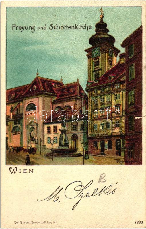 Leírás: 1899 Vienna, Wien; Freyung und Schottenkirche / church, Karl Stücker's Kunstanstalt 7203. litho s: Rosenberger (b)