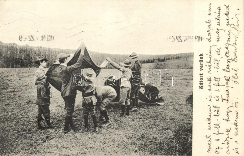 Sátort verünk, magyar cserkészek / Hungarian scouts with tents https://www.darabanth.com/hu/266-Gyorsarveres/266.0/Kepeslapok/Cserkesz~300076/Satort-verunk-magyar-cserkeszek-Hungarian-scouts-with-tents~II1321101