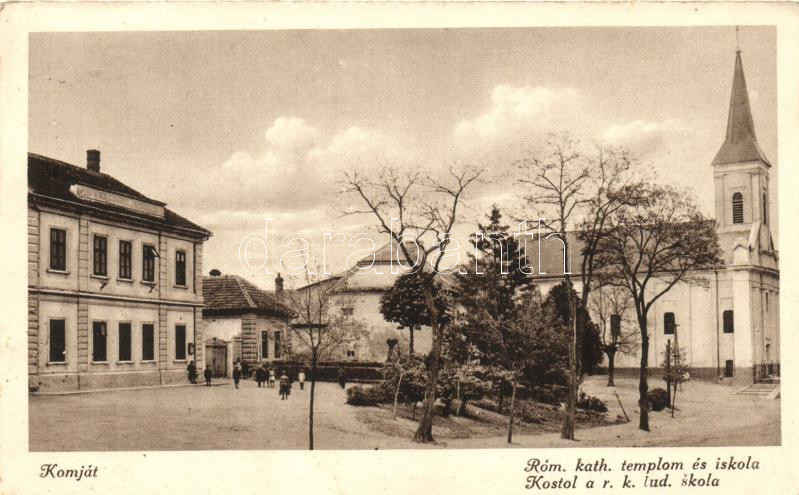 Leírás: Komját, Komjatice; Katolikus templom és iskola / catholic church, school