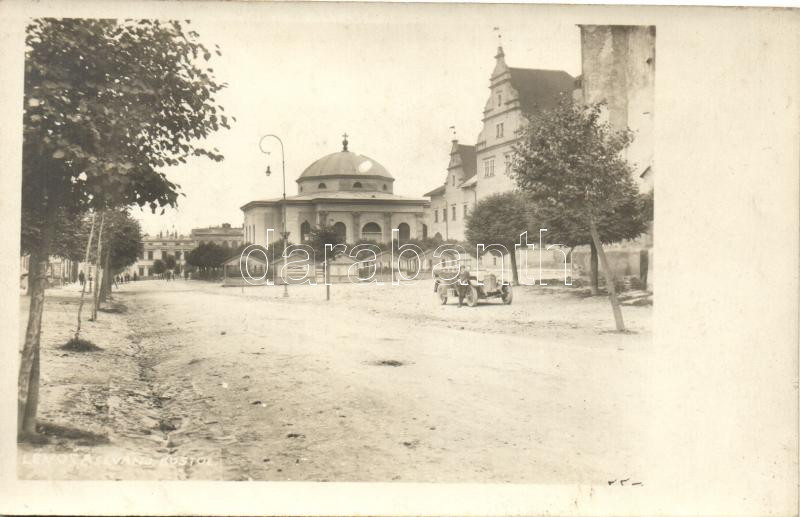 Leírás: Lőcse, Levoca; Evangélikus templom, üres piaci standok, automobil / Evangelic church, empty vendor booths, automobile, photo