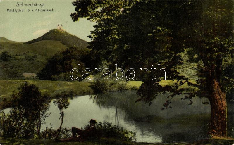 Leírás: Selmecbánya, Banská Stiavnica; Mihálytárói tó a Kálváriával, kiadja Joerges / lake with the calvary (fa)