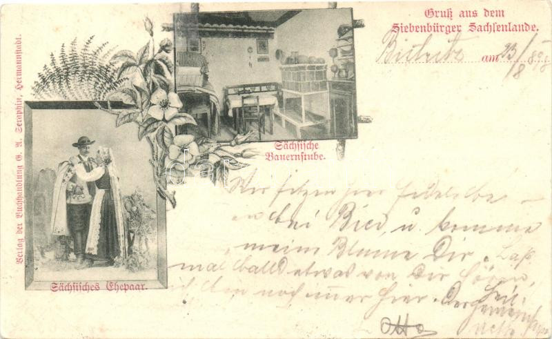 Leírás: 1898 Erdélyi szász folklór / Siebenbürgische Sachsenland, Sachsische Bauernstube, Sachsisches Ehepaar / Transylvanian Saxons folklore, floral (r)