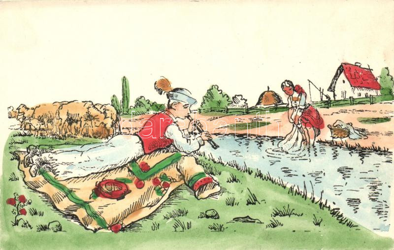 Hungarian rural folklore, girl washing clothes, boy playing flute, she... https://www.darabanth.com/hu/266-Gyorsarveres/266.0/Kepeslapok/Folklor~300081/Hungarian-rural-folklore-girl-washing-clothes-boy-playing-flute-sheep~II1216263