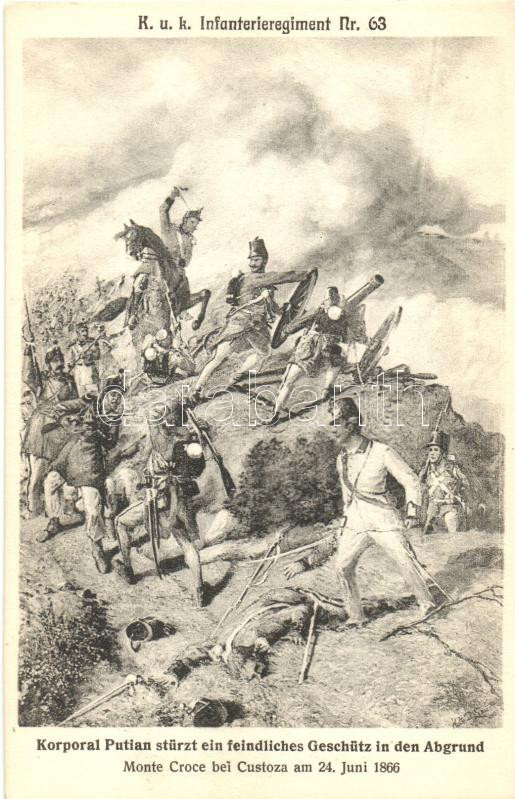 Korporal Putian stürzt ein feindliches Gesüchtz in den Abgrund / Corporal Putian overthrows an enemy cannon to the Abyss; Scene from the Austro-Prussian War, the Battle of Custoza