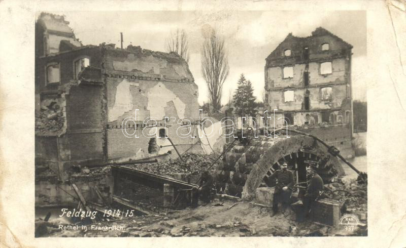 Rethel, France, watermill with German soldiers and destroyed buildings... https://www.darabanth.com/hu/266-Gyorsarveres/266.0/Kepeslapok/Katonai~300098/Rethel-France-watermill-with-German-soldiers-and-destroyed-buildings-WWI-EB~II1314057