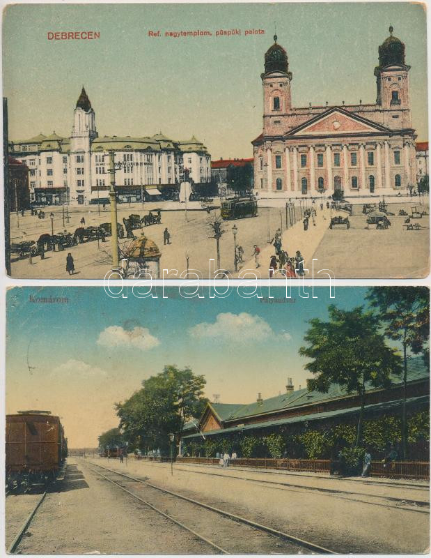 Leírás: Komárom vasútállomás + Debrecen Református nagytemplom - 2 db háború előtti városképes lap