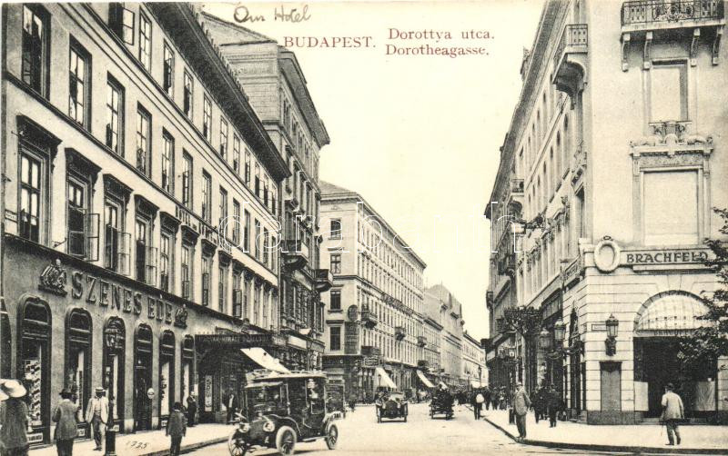 Leírás: Budapest V. Dorottya utca, Magyar Király Szálloda, Brachfeld üzlete, Szenes Ede üzlete, automobil